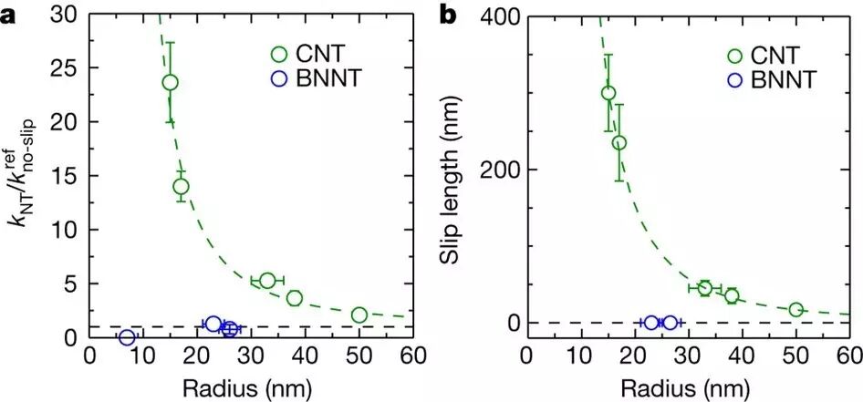 研究表明,碳纳米管中水的摩擦系数受半径影响:碳纳米管半径越小,摩擦系数越低。另外,研究人员在BN中没有发现滑移现象。这可能是由于BN和碳纳米管虽然在晶体结构上比较类似,而电子结构大不相同。碳纳米管和BN中的这种流动现象的差异可能来自于界面的原子尺度差异。